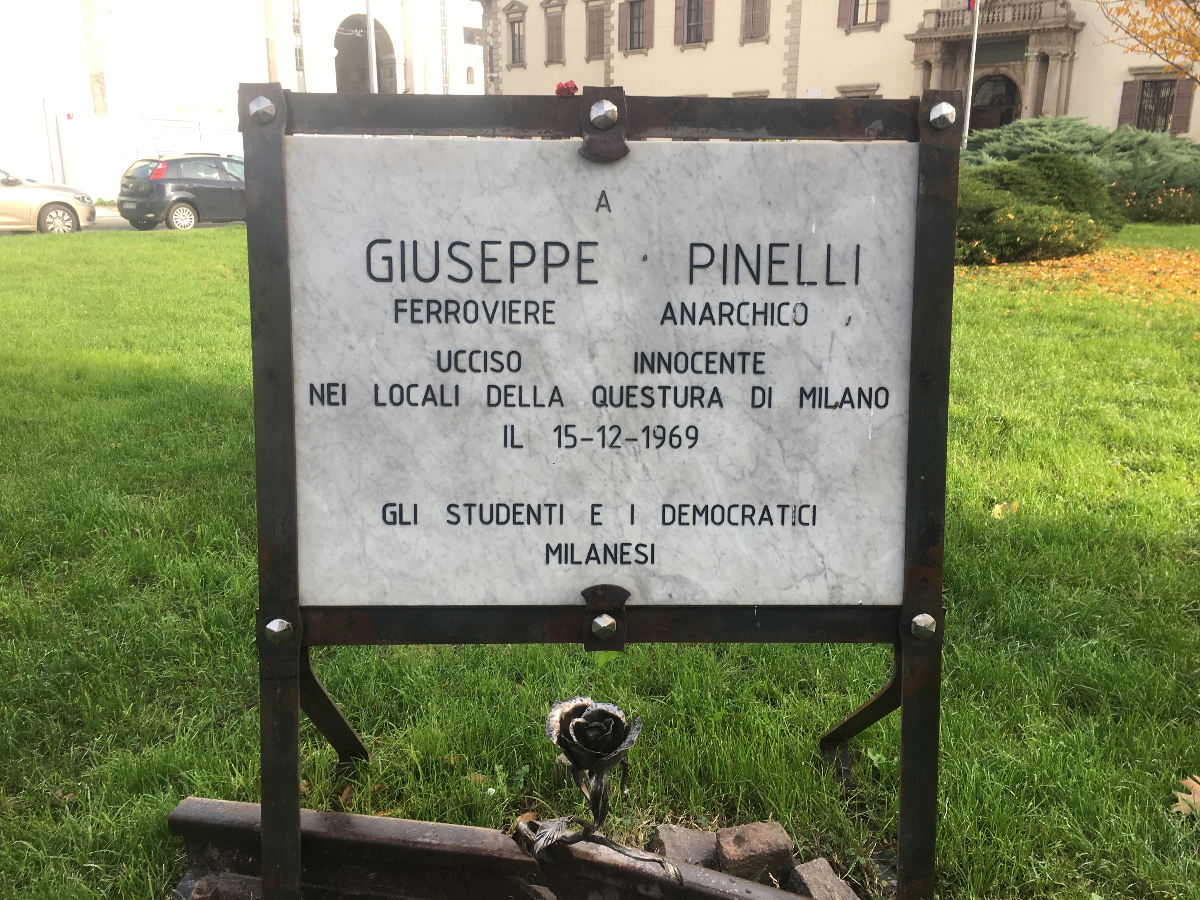 Questa mattina sono andato a vedere le due targhe dedicate a Pinelli in piazza Fontana, nel piccolo prato davanti alla Banca, di cui rimane solo l’insegna in grandi caratteri. Le due targhe sono diverse: in una, Pinelli è morto tragicamente, nell’altra, è stato ucciso innocente, ma la data di entrambe sarebbe sbagliata. La morte viene datata 15 dicembre (e non, anche se per poco, 16). Un lapsus. Come se fosse sottinteso, tacitamente, che Pinelli è stato gettato dalla finestra della questura già morto, così suggerisce la versione di ED. Coincidenze: la targa tragica è più consumata di quella omicida, le lettere sono un po’ smangiate.