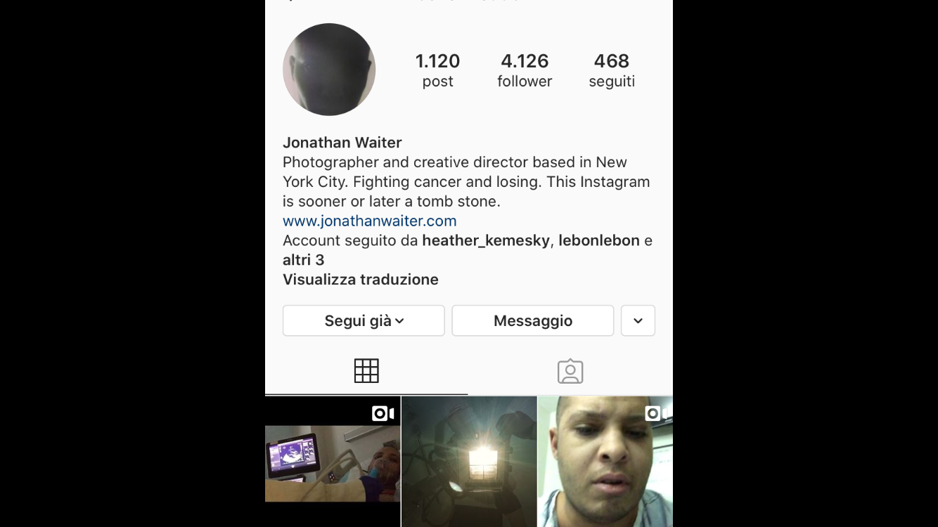 Ma riavvolgiamo il nastro, cioè scrolliamo lo schermo del cellulare. Siamo al 9 luglio 2012. Comincia qui il Calvario di JW sul profilo aperto apposta su Instagram per raccontarlo. JW che è un bel ragazzo, cool e smart, e di linguaggio internazionale, con un lavoro appealing in una città di sogno, NY. È l’immagine stereotipata, cioè, molto Instagram, di un piccolo vincente, che la malattia scheggerà a poco a poco, fino al crollo dei luoghi e dei loghi comuni delle nostre vite apparentemente felici.